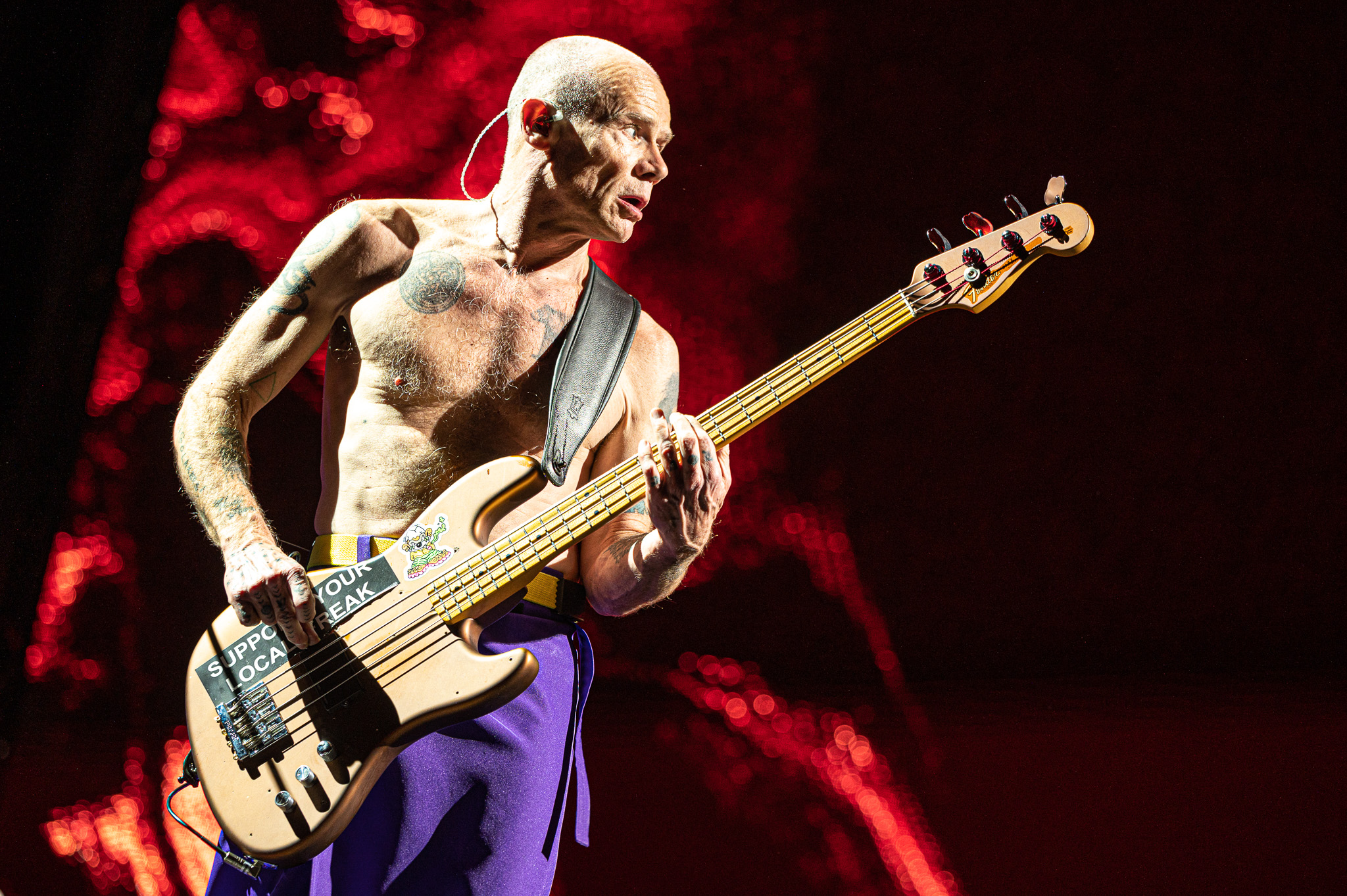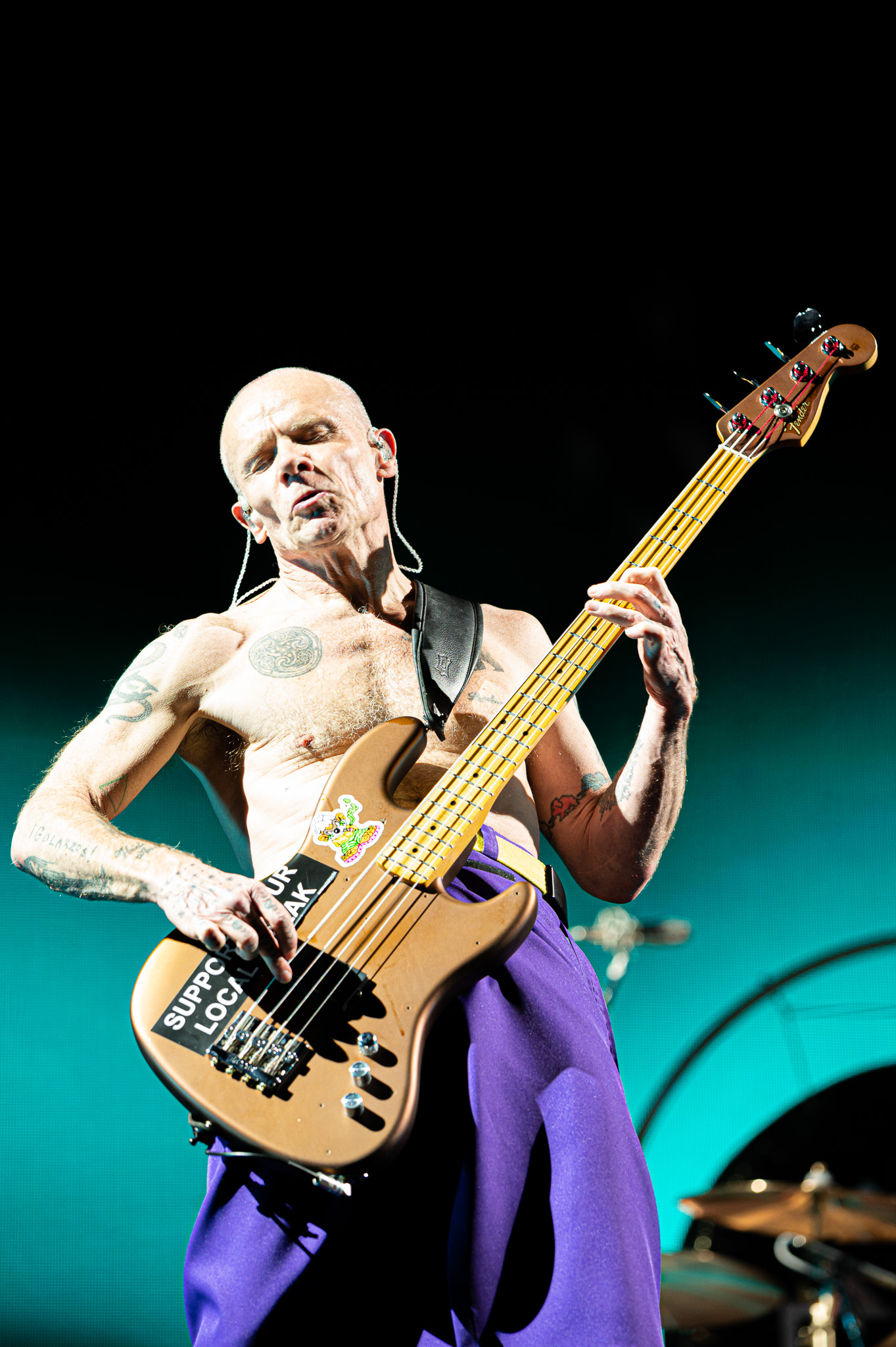 The obvious highlight, to any RHCP show, was bassist Flea, who entered the stage literally walking on his hands. For an instrument that usually just has musicians nodding along to the beat, Flea brought the most energy to the bass guitar that I have ever seen. Adorned in purple and gold matching socks and skirt, the shirtless musician whipped his head back and forth in a way that gave the impression that he was flipping his hair, despite clearly being bald. He was also the only member of the band to utilize the small platform off to the right of the main stage. I have always known that Flea was a talented musician, but to see him play live was something otherworldly.