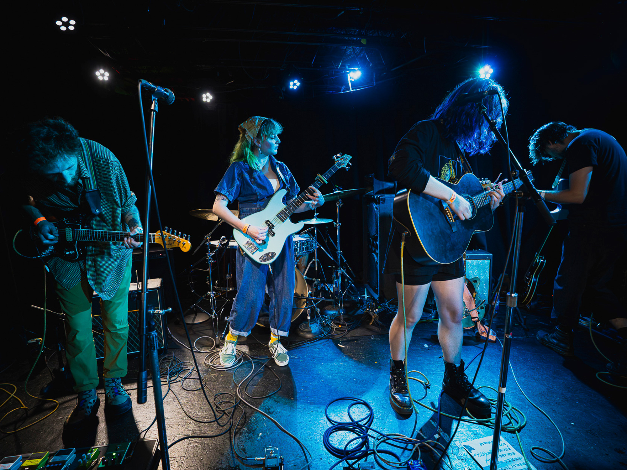 Dad Bod rounded out the night with a set of shoegaze tracks with folk and rock influences. The band consists of lead singer/guitarist Callie Marino, bassist Grace Baldwin, guitarists Noah Topliff and Wilson Zeller, and drummer Alex Gray. Fans of Phoebe Bridgers or Mitski will fall in love with Dad Bod and the mix of emotional vocal belts and passionate instrumentals. Every band member was enthusiastically into each song as they moved their bodies along with the music. They played a variety of songs, many of which were a preview to their upcoming album release, including their most recent single, “Milkdrinker.” Guitarist Zeller, who usually faces one of the amps while performing, turned around to the audience, mid set, to fill the dreaded tuning silence with a raunchy dad joke and sarcastic comments of dread from fellow bandmates followed. While it may have been slightly cringey, Zeller exhibited excellent crowd working skills in between songs which kept the audience engaged.