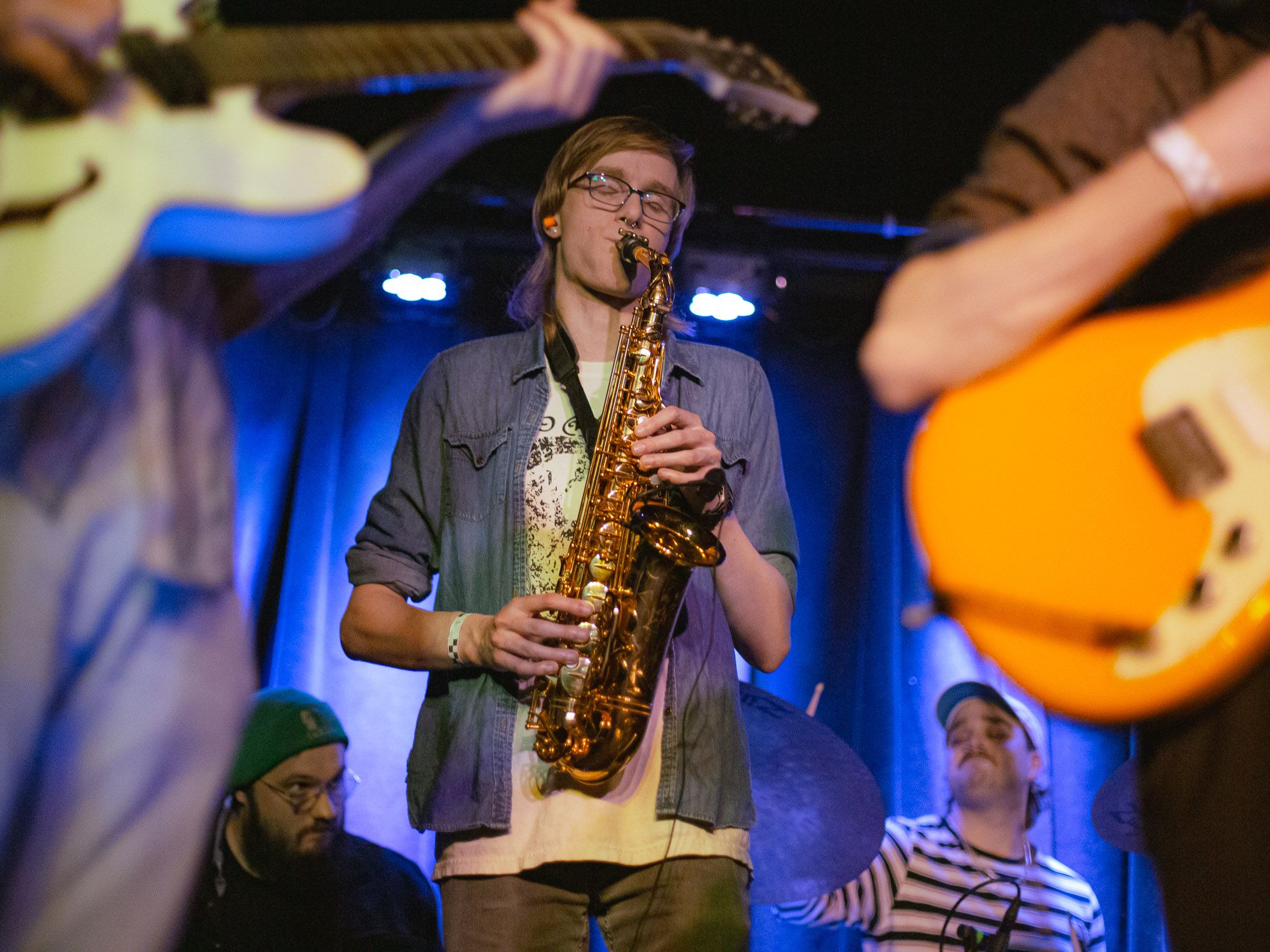 Headliners, NATL PARK SRVC wrapped up the show with a parade of musicians taking the stage and although there were a lot of moving pieces, each performer worked meticulously to get set up promptly. The band has always stood out to me largely due to just how many people they have in their group. NATL PARK SRVC features the collaborating talents of lead singer/guitarist Dylan Woytcke, bassist Nathan Zillmer, guitarist/vocalist Jared Leger, drummer Sage Livergood, violinist Sam Tudor, saxophonist Wes Muilenburg, and multi-instrumentalist Joe Keyport. In recent performances, the band has also included backing vocals from Shayla Larson and Whitney Oachs. With this many sounds being brought together simultaneously, technically speaking, it shouldn’t work as well as it does, which just goes to show the inherent genius behind the band. Fitting everyone on stage is an admirable act in and of itself, but more importantly, they successfully create one all-encompassing sound with the various talents that they have at their disposal and this is one of the reasons for why they have become so notable in the local music scene.