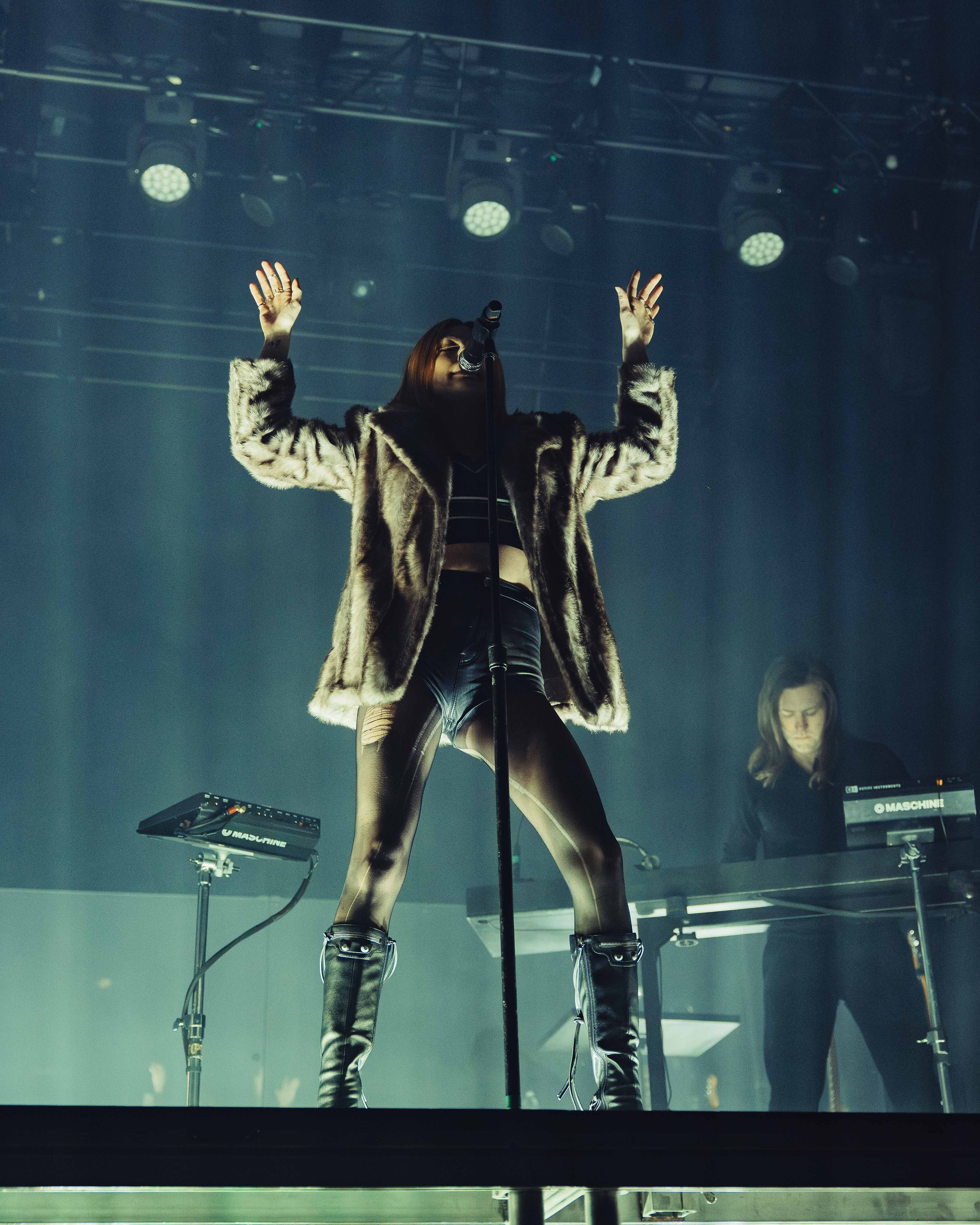 By 8:35 PM, the sold out crowd was rowdy and whistling in anticipation for Phantogram’s set. Suddenly, the lights went out and the fans erupted with cheers while each member took position on a transparent riser that was above the stage. The band was dressed in all black, with the addition of a bold fur coat worn by Barthel. Small moving lights below and beside them began to roll and flash singular colors like yellow and green, cutting through the darkness as Carhart began to bang on his drums and Shelestak used his synthesizer, starting off the night with a bang. They kicked off their set in full force with their song “Jealousy,” the introductory track to their new 2024 album, Memory Of A Day, detailing insecurity and possessiveness within relationships. Barthel’s ethereal vocals echo across the band’s electronic atmosphere. Their music is dark, haunting, and in your face. It is paired well with their dark stage presence, leaving more darkness than light. The lights below the riser illuminated the ground beneath their feet, rolling from left to right, first striking drummer Carhart on the left, highlighting lead singers Bethel and Carter at the center, and finally making its way to the right under synth programmer Shelestak. The band carried their heavy presence throughout the night making sure to touch their entire catalog. At one point they reached all the way back to their 2010 debut album, Eyelid Movies to play their hit song “Mouthful of Diamonds,” an old record about the tension between wanting to shine and the challenges that come with that pursuit. This performance was filled with dreamy synthesizers, punchy drum rhythms, intricate guitar melodies and emotionally weighing vocals. The crowd returned the energy with loud cheering, upbeat dancing, and reflective sing-alongs. As the night was coming to a close, they teased a closer with the song “Come Alive” and the lights went out with no good riddance. The crowd erupted with loud cheers anticipating a revival encore.